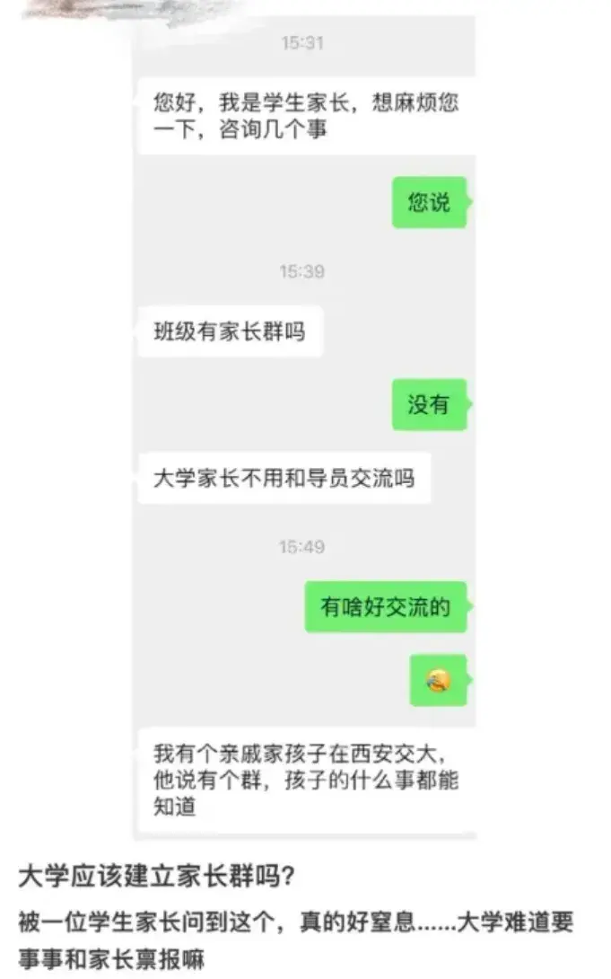 如果学校没有家长群,家长还会主动询问,如果辅导员回复没有,家长也会略有不满:大学家长不用和导员交流吗?