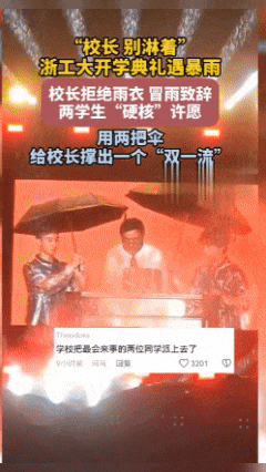 爆火的原因倒不是校长冒雨演讲这事儿,而是因为下面这个“名场面”。